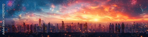 Obraz premium Panoramic Cityscape at Sunset with Silhouetted Crowd A Vibrant Celebration of...