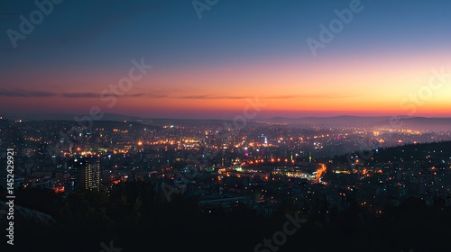 © Andi, Obraz premium Panoramic cityscape at twilight, illuminated by the colorful sunset.