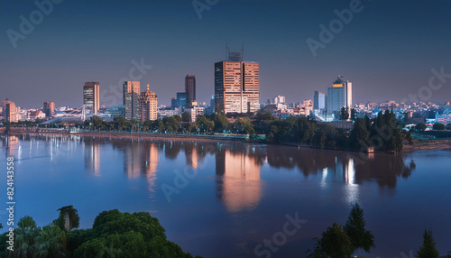Naklejka premium Panoramic Cityscape Photography with Buildings, Lake or River at Sunset