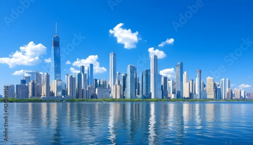 © LAILY, Fototapeta premium Panoramic cityscape skyline reflected in calm water under a vibrant blue sky