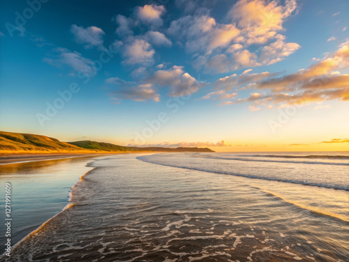 Fototapeta premium Panoramic coastal scene with calm waves at golden hour beachfront landscape...