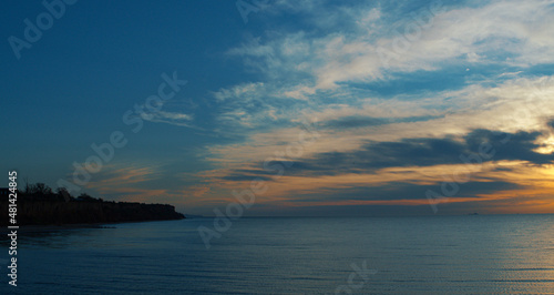 © stockbusters, Fototapeta premium Panoramic coastline view with sky. Meditative sea surface reflecting sunlights.