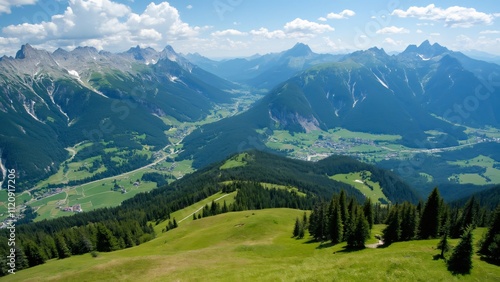 Fototapeta premium Panoramic Dolomites Mountain View, Alpine Village, Winding Road, Summer Scenery