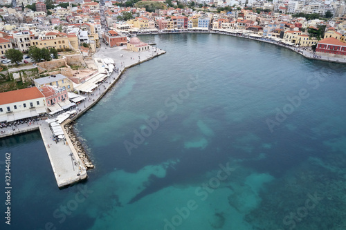 © Mindaugas, Fototapeta premium Panoramic drone aerial view from above of the city of Chania, Crete island, Greece. Landmarks of Greece, beautiful venetian town Chania in Crete island. Chania, Crete, Greece.