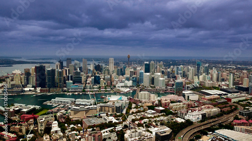 © Elias Bitar, Obraz premium Panoramic drone aerial view over Sydney harbour on a cloudy sunset showing the nice colours of the CBD aparments and officer towers