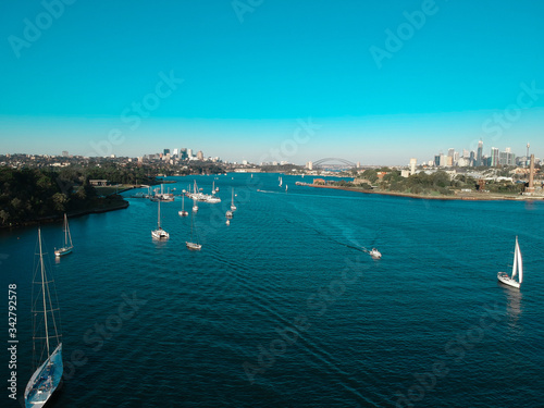 © Elias Bitar, Fototapeta premium Panoramic drone aerial view over Sydney harbour on a cloudy sunset showing the nice colours of the harbour foreshore