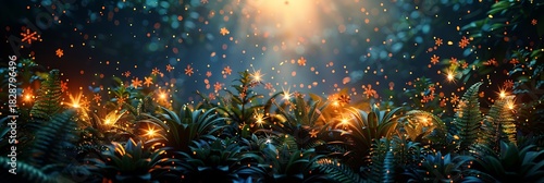 Fototapeta premium Panoramic Enchanted Forest Night Scene With Glowing Lights and Lush Foliage