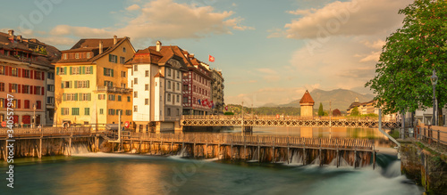 © emotionpicture, Naklejka premium Panoramic evening view of popular tourist attraction with historic Chapel bridge. Spectacular spring cityscape of Lucerne. Stunning outdoor view of Switzerland, Europe. Traveling concept background.