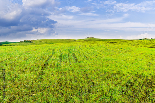 © Yaroslav, Fototapeta premium panoramic farmland landscape with green spring field , salad and yellow hills, garden and grassland and beautiful cloudy sky.