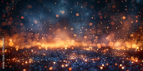 © Micro, Naklejka premium Panoramic Golden Fireflies and Sparks Abstract Background with bokeh effect
