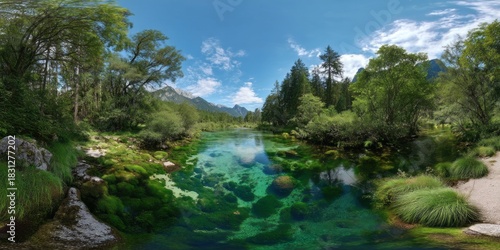 Fototapeta premium Panoramic hdr view of crystal clear river nature landscape lush green environment