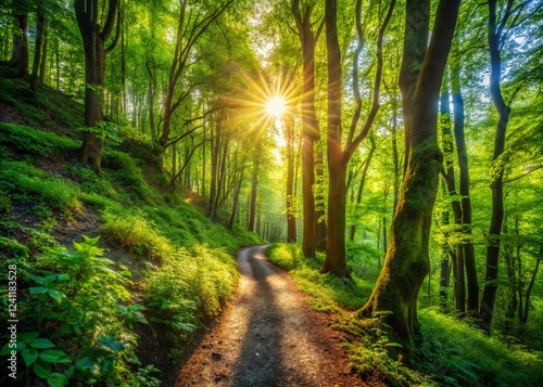© Arnada, Fototapeta premium Panoramic Hiking Trail Through Lush Green Forest - Peaceful Nature Escape