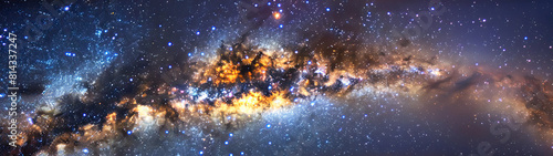 Obraz premium Panoramic image capturing the breathtaking expanse of the Milky Way galaxy, with its radiant core and dense star clusters.