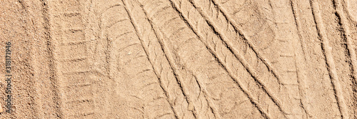 Fototapeta premium Panoramic image. Tire tracks on the sand. Sand texture