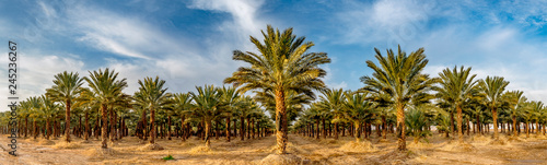 Naklejka premium Panoramic image with plantation of date palms, image depicts an advanced...