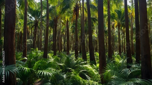 © KAThakshala, Fototapeta premium Panoramic Jungle View: Euterpe Edulis Palms with Light and Shadow Play