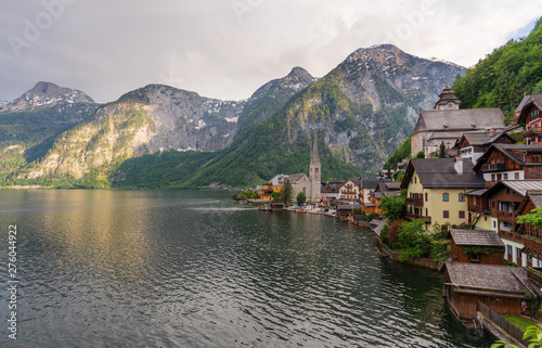 Fototapeta premium Panoramic lake with mountain and Hallstatt village in summer, famous landmark...