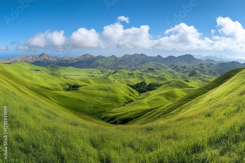 Fototapeta premium Panoramic landscape, rolling green hills, misty mountains, vibrant meadow, lush countryside, blue sky, fluffy white clouds