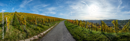 © Bernd Schmidt, Fototapeta premium Panoramic landscape scenery vineyard yellow fall with blue sky