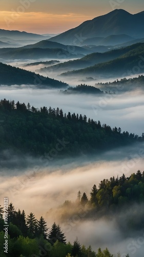 © Natallia, Fototapeta premium Panoramic landscape showcasing evening mountains covered in rich verdant forest