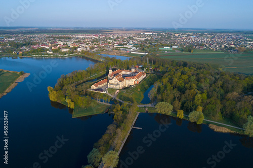 © sikaraha, Fototapeta premium Panoramic landscape with Nesvizh castle on a sunny May day (aerial view). Belarus