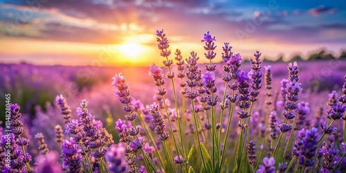 © prapatsorn, Naklejka premium Panoramic Lavender Field: Purple Flower Blossom in Summer Garden, Macro Floral Beauty