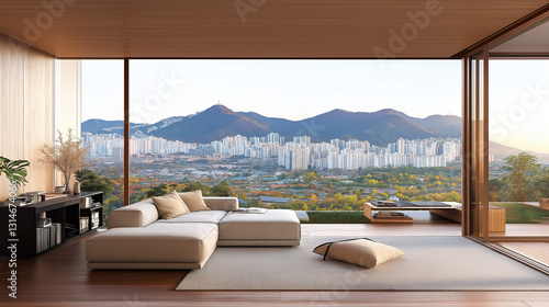 © Wasin Arsasoi, Fototapeta premium Panoramic Living: A modern, spacious living room with expansive windows offers a stunning view of a cityscape and majestic mountains. This interior design showcases comfort and urban serenity.