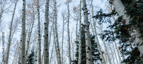 © mdurson, Fototapeta premium Panoramic low angle bare aspen trees against blue sky