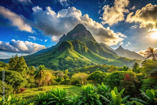 Fototapeta premium Panoramic Majestic Mountain Peak Tropical Paradise Sunny Sky Landscape Photography