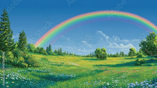 Naklejka premium Panoramic meadow landscape, vibrant colors, rainbow