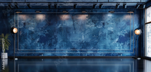 © Sajida, Obraz premium Panoramic mock up poster gallery with indigo wall, glossy floor, and modern spotlights.