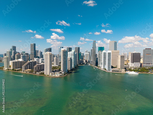 © be free, Obraz premium Panoramic modern architecture in Miami downtown, Florida. Miami skyline panoramic view. Aerial view of cityscape with skyscraper in Brickell Key, United States. Downtown Brickell Miami