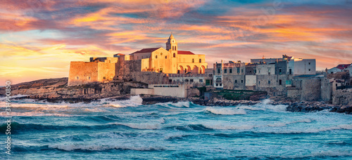 © Andrew Mayovskyy, Naklejka premium Panoramic morning cityscape of Vieste - coastal town in Gargano National Park with Church of San Francesco, Italy, Europe. Spectacular spring sunrise on Adriatic sea.
