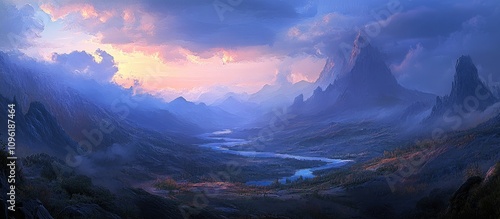 © MetaPixel, Naklejka premium Panoramic mountain landscape at dusk showcasing layered blue mountains and a winding river under a dramatic sky