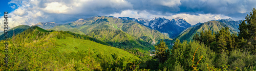 © Ployker, Fototapeta premium panoramic mountain landscape with contrasting snowy peaks and lush green slopes under dramatic cloudy sky