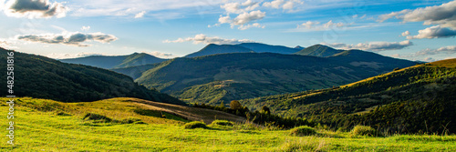 Naklejka premium panoramic mountain landscape with green meadows in evening light. beautiful summer scenery with clouds on a blue sky
