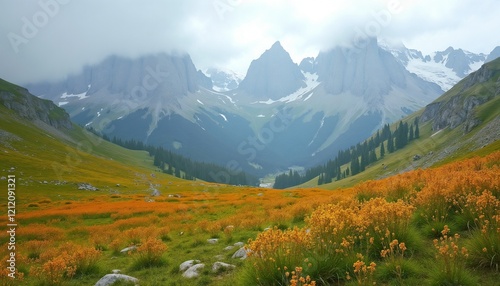 © SweGo, Obraz premium Panoramic mountain pasture with bright vegetation against a backdrop of misty peaks