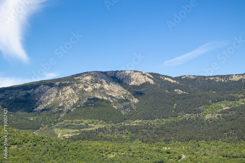 Obraz premium Panoramic mountain photograph with green trees and nature with blue sky