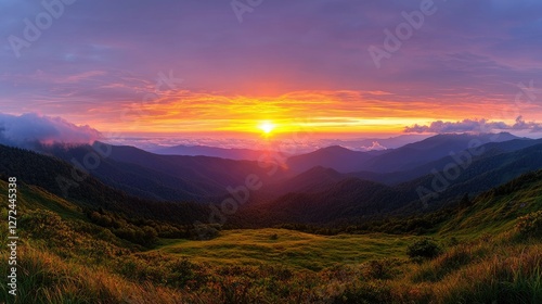 © danadesa, Fototapeta premium Panoramic Mountain Sunset Over Valley Meadow