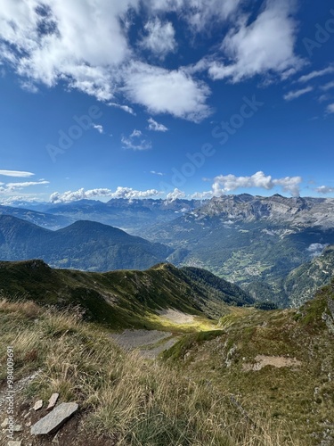 © Joris, Fototapeta premium Panoramic Mountain Valley Under Bright Blue Sky with Scenic Clouds