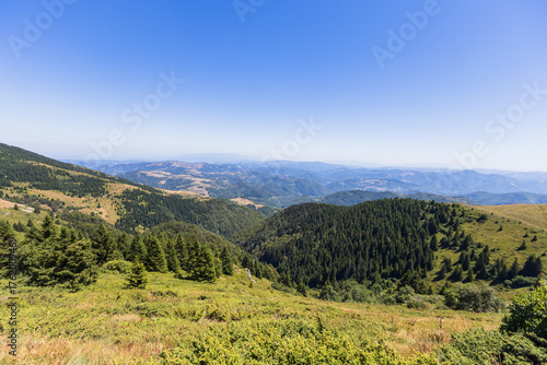 Obraz premium Panoramic mountain valley view with rolling hills and evergreen forest