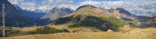 Fototapeta premium Panoramic mountain view, morning light. Steep slopes, snowy peaks and forest. Traveling in the mountains, trekking.