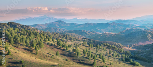 Obraz premium Panoramic mountain view, ridges in sunset light