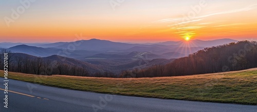 © BISMILAH, Fototapeta premium Panoramic mountain vista at sunset along a scenic road with golden light