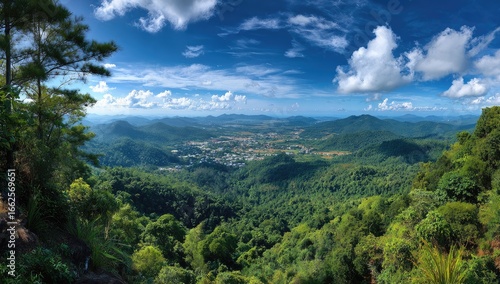 Fototapeta premium Panoramic mountain vista, lush green forests, and a valley town nestled below