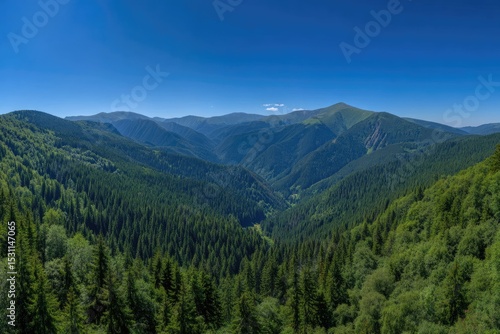 Fototapeta premium Panoramic mountain vista. Lush green forests blanket valleys and slopes beneath a clear blue sky