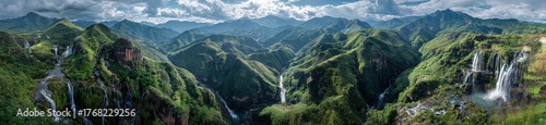 © muhammad, Naklejka premium Panoramic mountain vista with cascading waterfalls
