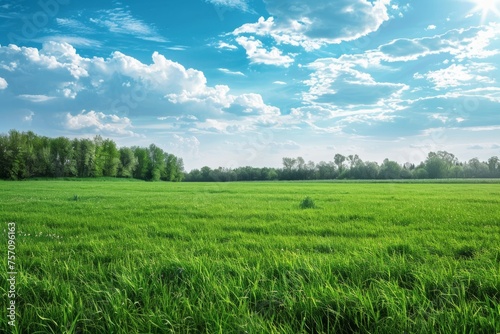 Fototapeta premium Panoramic natural landscape with green grass field, blue sky with clouds and...