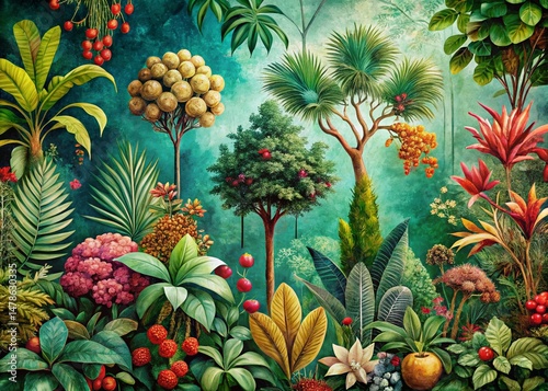 © Arnada, Fototapeta premium Panoramic Nature-Inspired Plant & Tree Illustrations on Textured Wallpaper Background