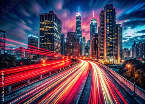 © Four888, Obraz premium Panoramic Night Cityscape with Dynamic Red Light Streaks - Abstract Background